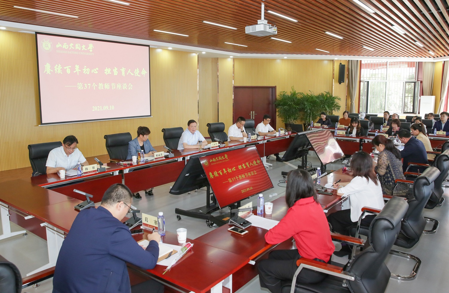 上午9时,一场气氛热烈的教师节座谈会在文德楼一层会议室拉开帷幕,二级教授,国家级、省级一流课程负责人,省级教学名师、省级教学能手、辅导员、退休教师、新入职教师代表等欢聚一堂,跟着校党委常委、副校长姚丽英重温习近平总书记的谆谆教诲,畅谈学校事业兴旺发展,共话教书育人神圣使命,聆听校党委书记弓永华“坚守‘四心’争做新时代的好老师”的热切期待。