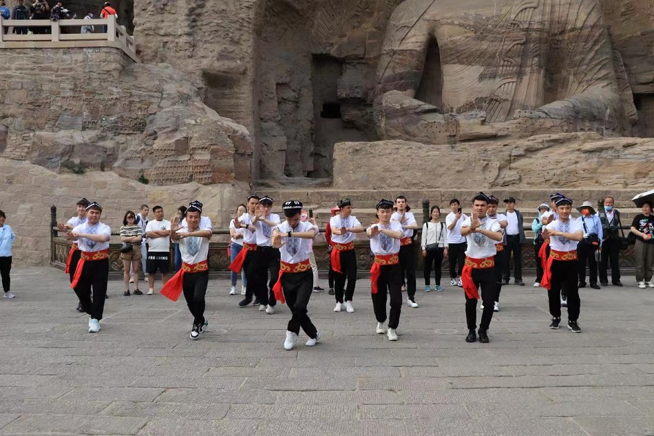 参观完毕后,少数民族学生在“昙曜五窟”前的广场跳起了欢快的少数民族舞蹈,还集体深情朗诵了《中国共产党的一百年》,以此表达对民族大团结的赞美,对祖国母亲、对中国共产党的感激和热爱之情,赢得了现场游客的阵阵掌声。建筑与测绘工程学院的热汗古丽•克依木江同学深情地说,一部中国史,就是一部各民族交融汇聚成多元一体中华民族的历史,各民族同呼吸、共命运、心连心,不断铸牢中华民族共同体意识,像石榴籽那样紧紧拥抱在一起,才有前途,才有希望。