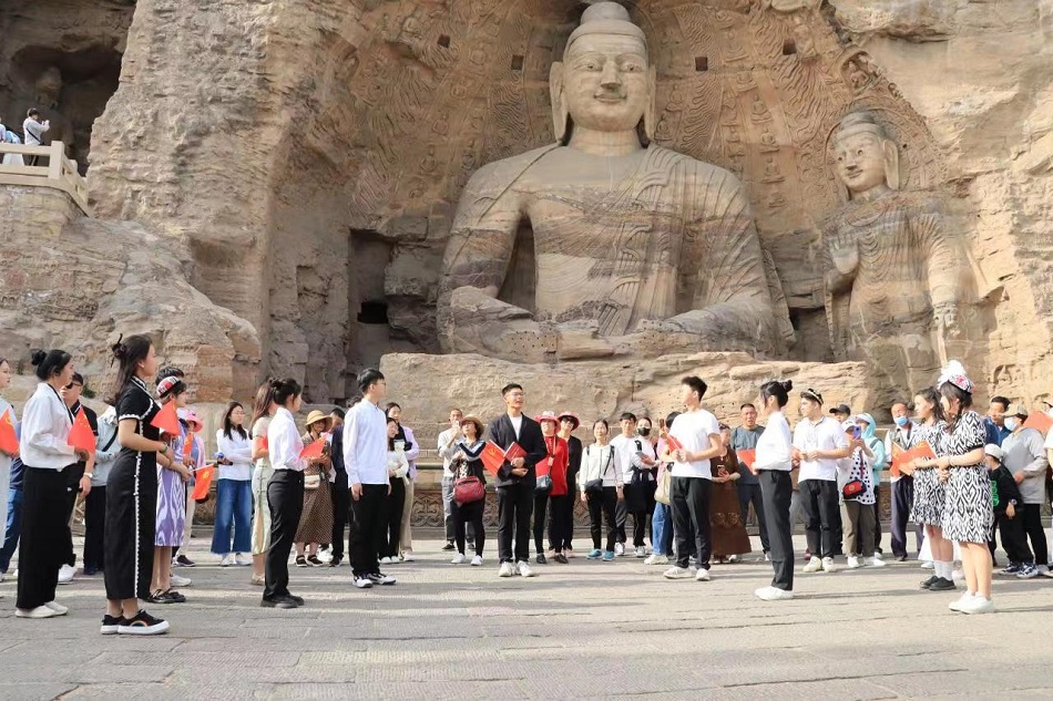 云冈石窟作为世界文化遗产,融汇了鲜卑、汉等民族以及中亚文化的精髓,是北魏文明的绚丽瑰宝,是各民族交往交流交融的结晶。在专业讲解员的带领下,师生们兴致勃勃地参观了各个石窟,全面了解云冈石窟发展与变迁,为云冈石窟的深厚文化内涵和辉煌艺术成就所感染,深深体会到了这座文化宝库的独一无二,领略到了中国古代建筑与雕刻艺术的无限魅力,更加深刻地领悟了习近平总书记考察石窟时的重要指示精神,“坚定文化自信”的信心和决心更加笃定。
