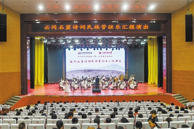 本报讯(记者丁亚琴)6月12日,大同大学大型民族管弦乐作品《云冈石窟诗词民族管弦乐》汇报演出在新荣区工人文化宫拉开帷幕。作品以世界文化遗产云冈石窟为创作灵感,融合诗词吟诵与民族管弦乐,为观众呈现跨越千年的艺术盛宴,展现深厚历史文化底蕴与现代艺术创新力。