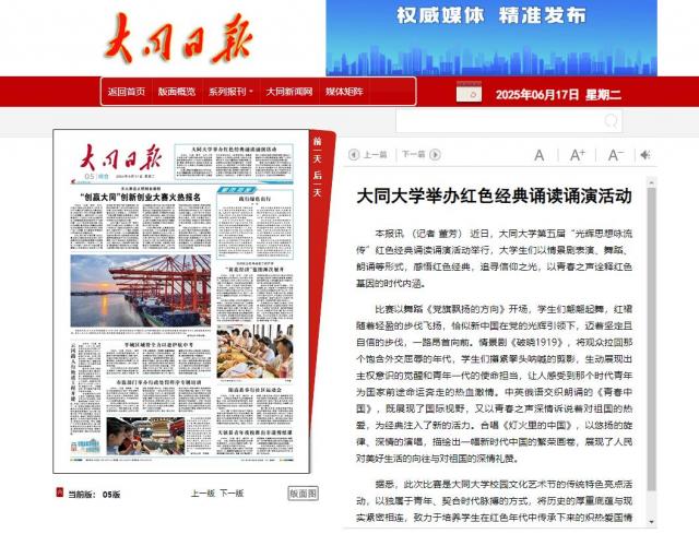 本报讯(记者 董芳)近日,大同大学第五届“光辉思想咏流传”红色经典诵读诵演活动举行,大学生们以情景剧表演、舞蹈、朗诵等形式,感悟红色经典,追寻信仰之光,以青春之声诠释红色基因的时代内涵。