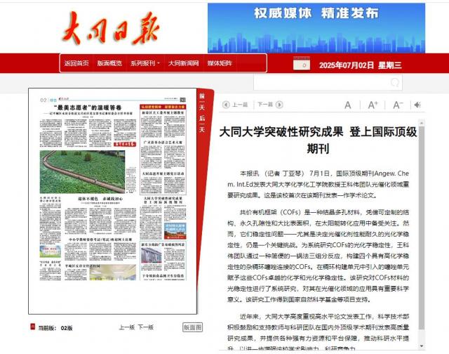 近年来,大同大学高度重视高水平论文发表工作,科学技术部积极鼓励和支持教师与科研团队在国内外顶级学术期刊发表高质量研究成果,并提供各种强有力资源和平台保障,推动科研水平提升,以进一步增强该校学术影响力、科研竞争力。