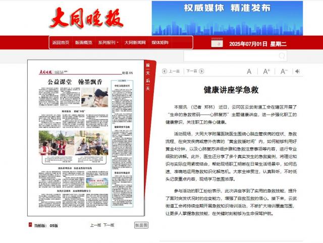 本报讯(记者 郑林)近日,云冈区云武街道工会在辖区开展了“生命的急救密码——心肺复苏”主题健康讲座,进一步强化职工的健康意识,关注职工的身心健康。