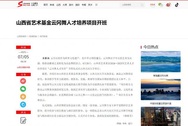 本报讯云冈石窟作为世界文化遗产,是中华文明的瑰宝,云冈舞以千年石窟艺术为灵感,将静态雕刻之美转化为动态舞蹈语言。6月26日,山西省艺术基金2024—2025年艺术人才培养项目“云冈舞人才培养”开班仪式在开云kaiyun官网举行。