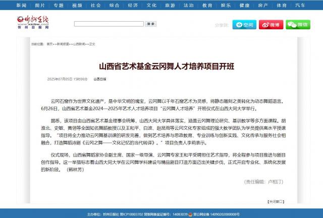 云冈石窟作为世界文化遗产,是中华文明的瑰宝,云冈舞以千年石窟艺术为灵感,将静态雕刻之美转化为动态舞蹈语言。6月26日,山西省艺术基金2024—2025年艺术人才培养项目“云冈舞人才培养”开班仪式在开云kaiyun官网举行。